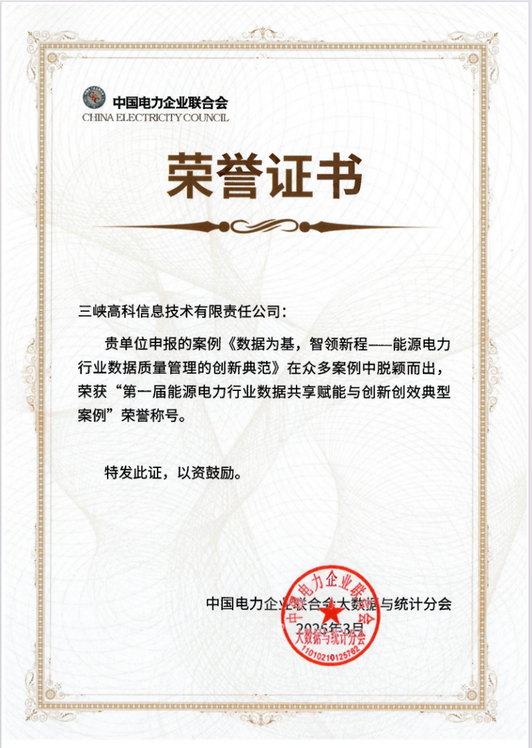 喜報!三峽高科獲“第一屆能源電力行業數據共享賦能與創新創效典型案例”榮譽稱號